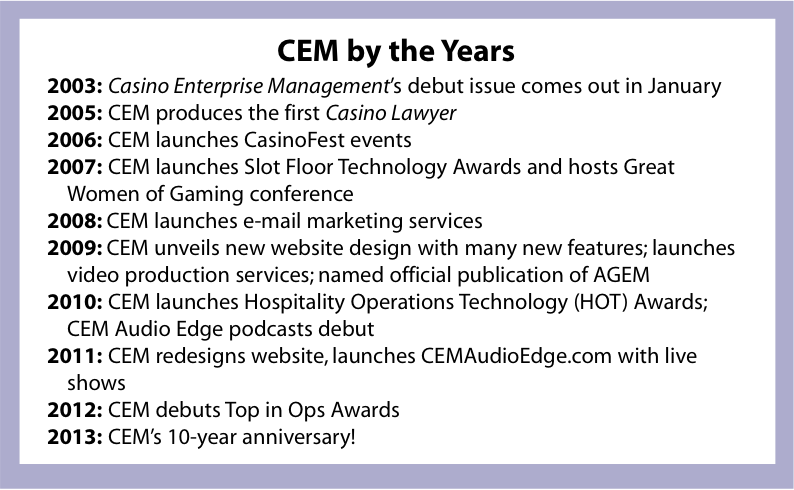 Well, we made it past the rumored end of the world. I’m glad we did, because 2013 is a big year for Casino Enterprise Management. We have many exciting milestones, new offerings and initiatives to share with you. One that we are most excited about is the celebration of our 10-year anniversary. Can you believe our very first issue debuted 10 years ago in January 2003?! Boy, have we evolved. Looking back at our history, we are so proud of where we came from and where we are today.