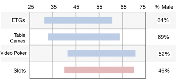 In Figure 1, we show the typical age ranges of different gaming product segments from a real but unnamed casino. The dominant gender is also indicated by color—blue for male, pink for female. The core slot players are in their 50s and 60s. Video slot and mechanical reel players skew more female. Video poker and slots have fairly equal gender distributions.