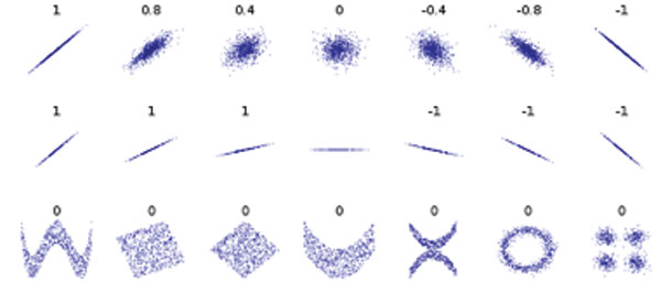Pearson’s Correlation measures the strength of dependence between two variables. The table in Figure 2 is a series of (x,y) scatter plots and the associated Pearson’s Correlation coefficient of x and y for each set. Note that the correlations illustrated reflect the non-linearity and direction of a linear relationship (as in the top row), but not the slope of that relationship (middle row), nor many aspects of non-linear relationships (bottom row). Also note that the figure in the center has a slope of zero, but in that case the correlation coefficient is undefined because the variance of y is zero.3