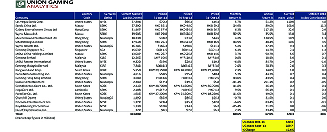 The UGA index for the period ending Oct. 31, 2013, was up 10.6 percents equentially to 320.3 from 289.7 at Sept. 30, 2013. As an illustrative example, if an investor bought $100,000 of the index on Sept. 30, 2013, the investment would hypothetically be worth $110,563 on Oct. 31, 2013. On a year-to-date basis, the UGA Index is up 70.1 percent.
